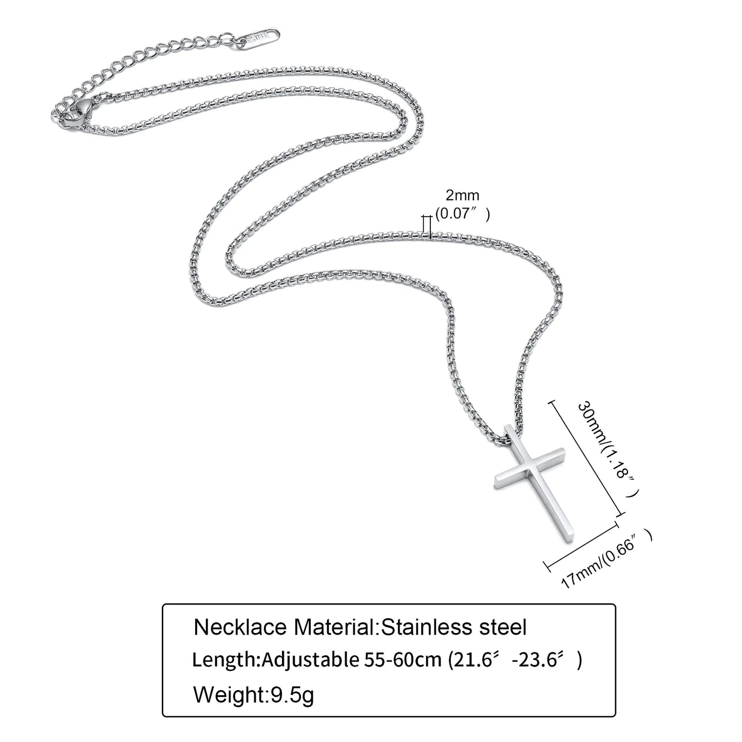 Complete with a rope box chain that beautifully complements the pendant, this necklace offers a timeless and versatile design. The combination of the cross pendant and the chain creates a look that is both simple and impactful, making it suitable for a wide range of occasions.